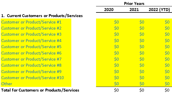 Start with compiling a list of your Top Customers/Target Markets or top selling Products/Services based on sales $ over the past 1-3 years. Try to account for at least 80% of the prior years’ sales. This can be pulled from your accounting software (e.g. QuickBooks) or you should be able to generate some reports from your POS system or whatever method you’ve previously been using to track your sales. You will then want to enter those Top Customers/Target Markets or top selling Products/Services into a spreadsheet like the one shown below to assist you in analyzing your historical sales: